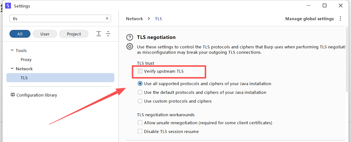 - 人话解释:让 Burp 闭眼盲信 Xray,不要检查 Xray 的证书合不合法。