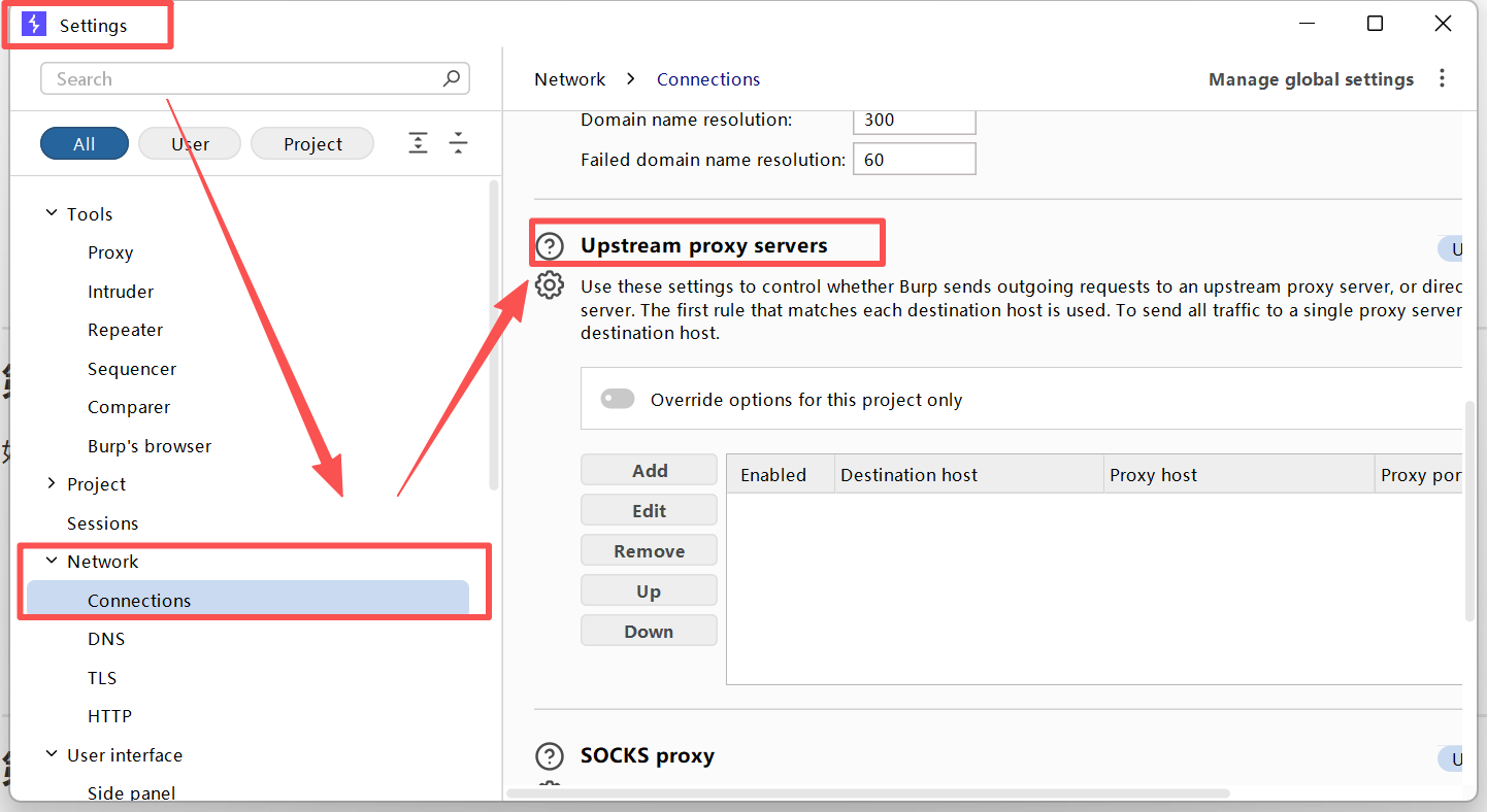 - Burp 的 Upstream 规则 取消勾选。
