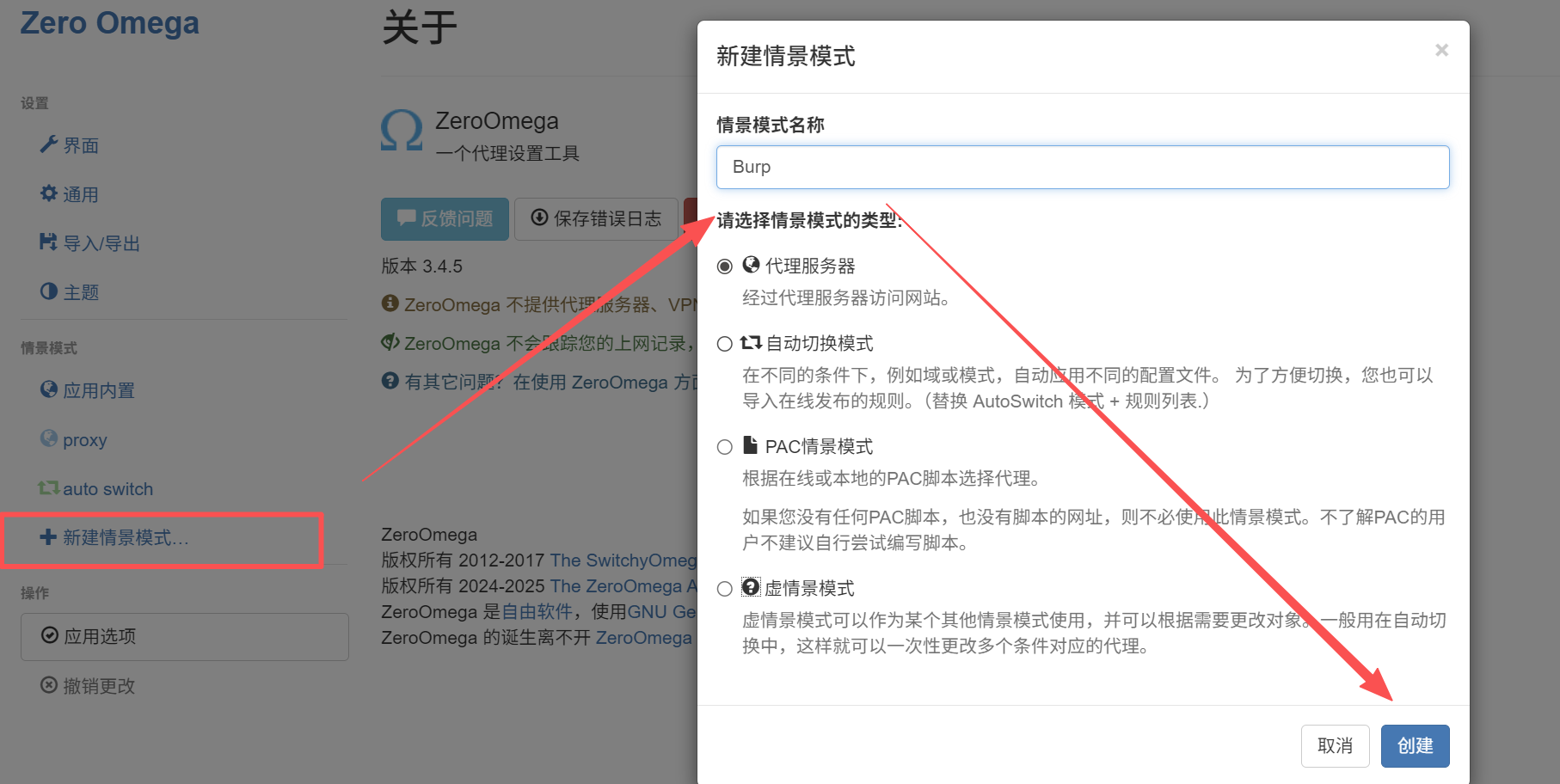 左侧点击 New Profile (新建情景模式),名字随便起(比如 Burp),类型选 Proxy Profile(代理服务器)。