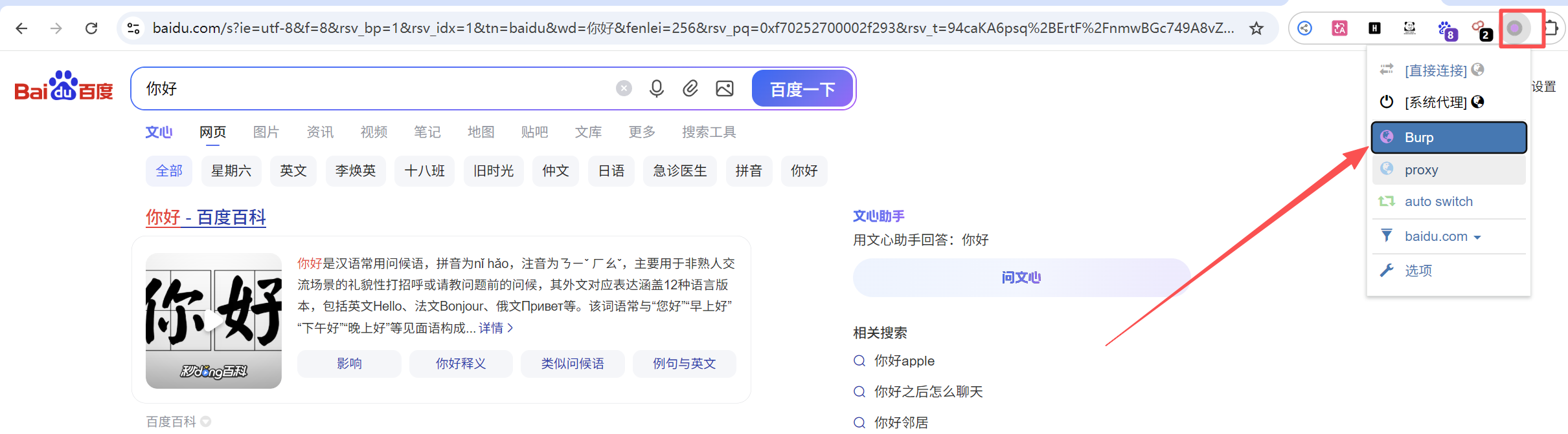 启用代理: 点击浏览器右上角圆环图标,选择你刚才建的 Burp 模式。此时圆环会变色,说明"路障"设好了。