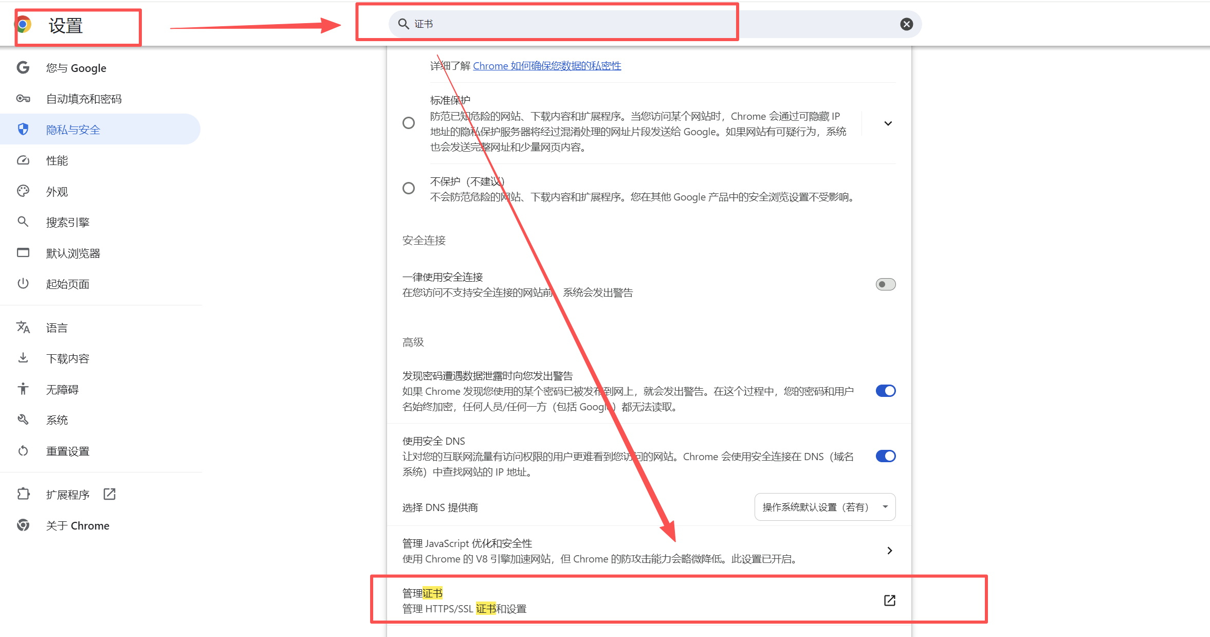 - 打开浏览器 设置 (Settings) -> 搜索 "证书" -> 点击 管理设备证书 (Manage certificates)。
