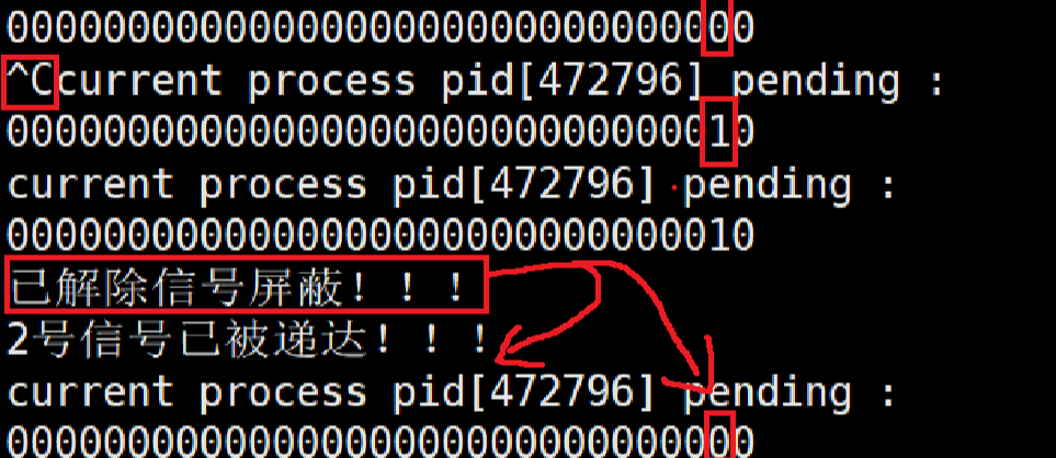 实验结果可以看到在解除屏蔽后,立马执行了自定义函数并且pending中2信号的位置由1->0(其实真实顺序是pending表先恢复为0,随后执行自定义函数,输出顺序可能会导致误解)