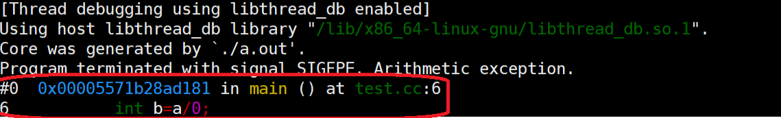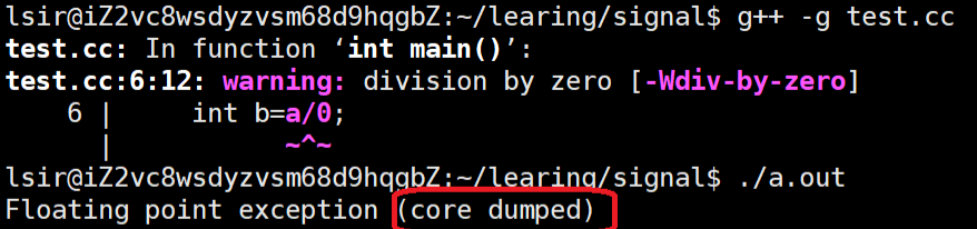 我们修改完后进行一个小测试:写一段简单的除0错误代码(注意:想要生成更方便调试的core文件的话需要携带-g选项)