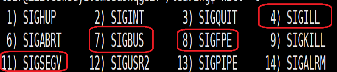 当程序发生段错误、除0错误、浮点异常等CPU会触发中断,同时内核向进程发送相应信号。常见的如SIGSEGV:段错误信号、SIGFPE:浮点异常信号、SIGILL:非法指令信号、SIGBUS:总线错误信号