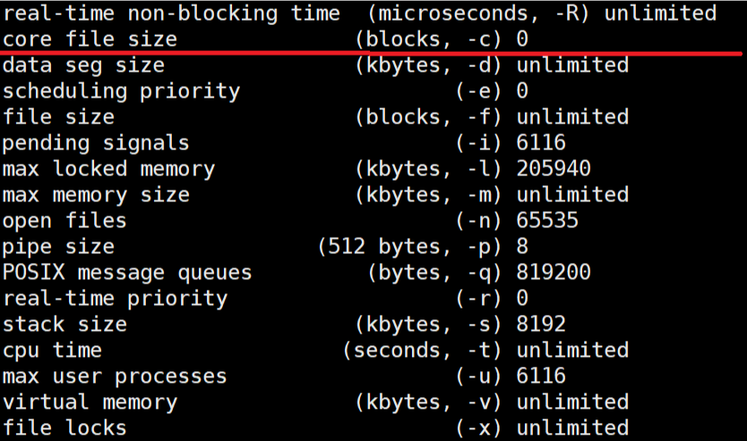 通常云服务器不会默认开启core dump开关,导致进程在core终止后并没有所谓的转储文件,那么如果需要生成转储文件如何打开开关呢?首先我们可以在bash输入指令ulimit -a查看进程资源限制(含 core 文件大小)