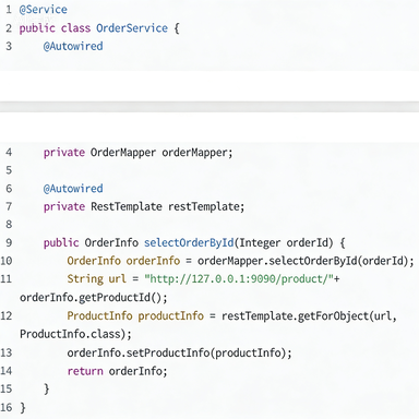 :order-service服务向product-service服务发送⼀个http请求,把得到的返回结果,和订单结 果融合在⼀起,返回给调⽤⽅