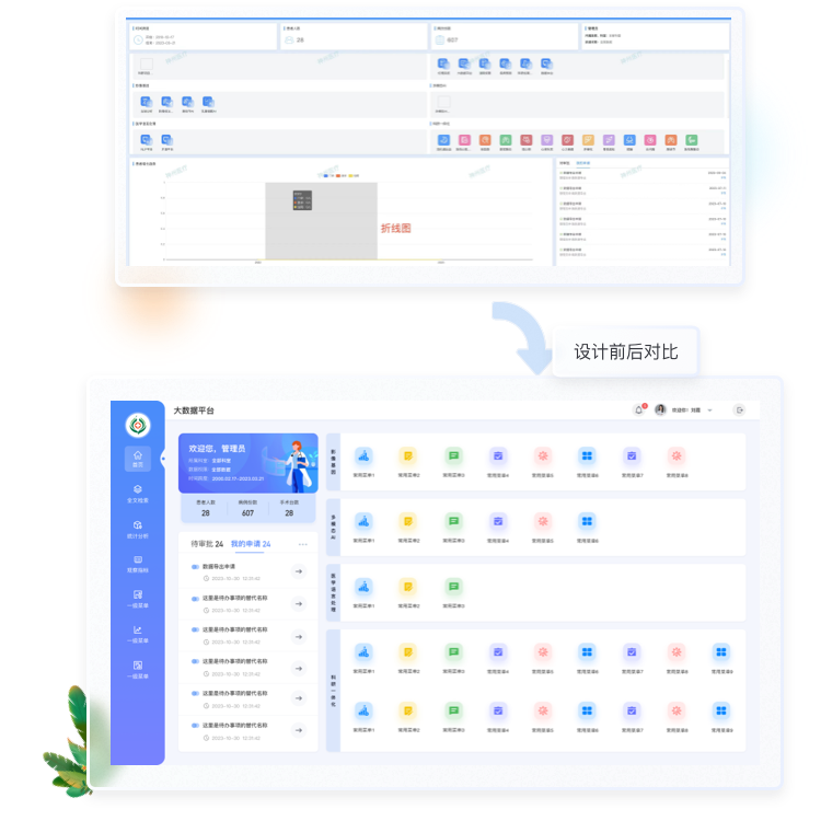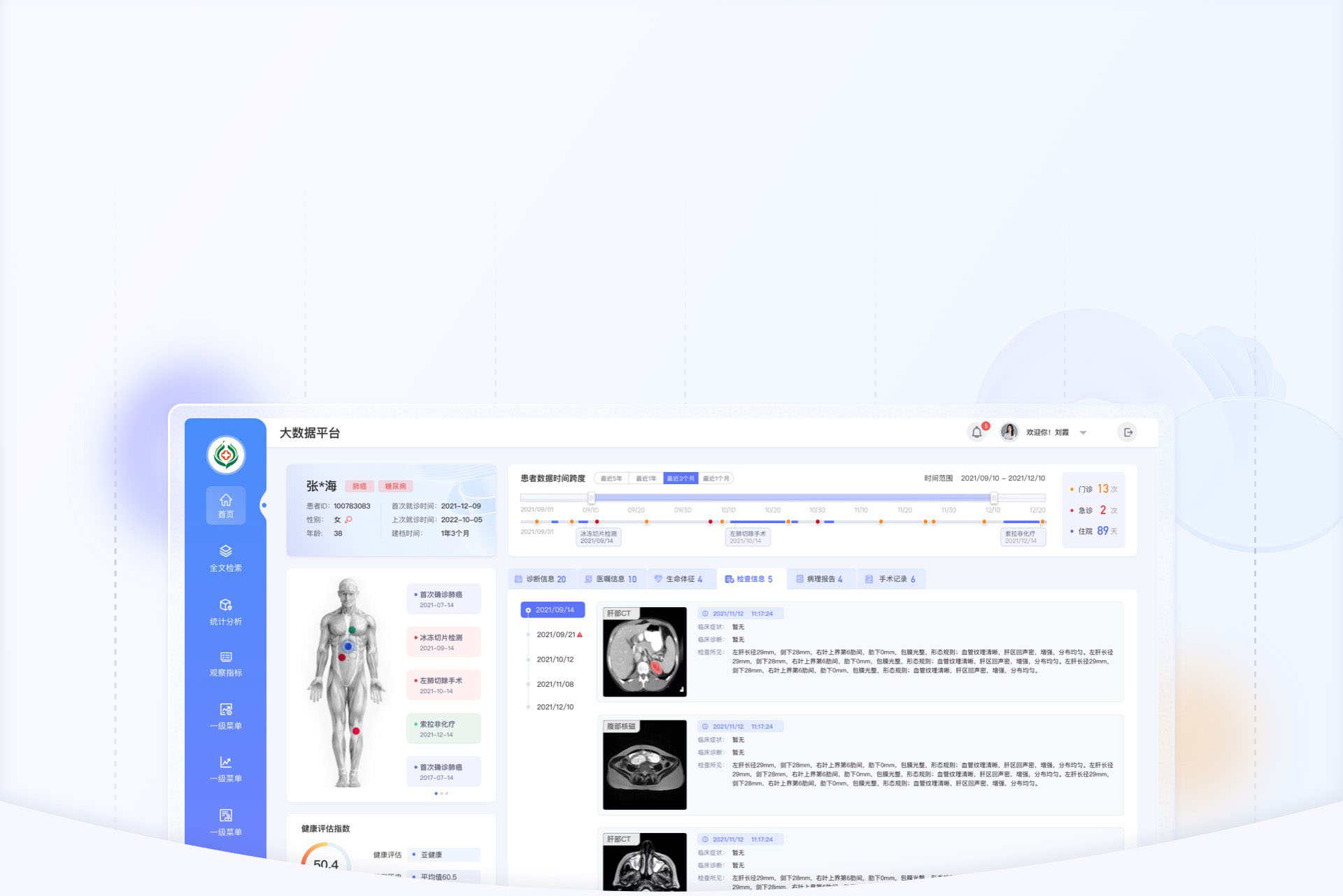 核心数据突出显示-原来首页没有登录人员信息,并且 [患者人数]、T病例份数]、手术台数,等数据每个占据一个大框显示页面显得空洞,通过整合增加登录人员信息以及欢迎语,使整个页面更有亲和力,一些相关数据采用卡片叠加的形式展示,不能可以增加整个页面的灵动感,并且把登录人员的相关信息紧密关联起来