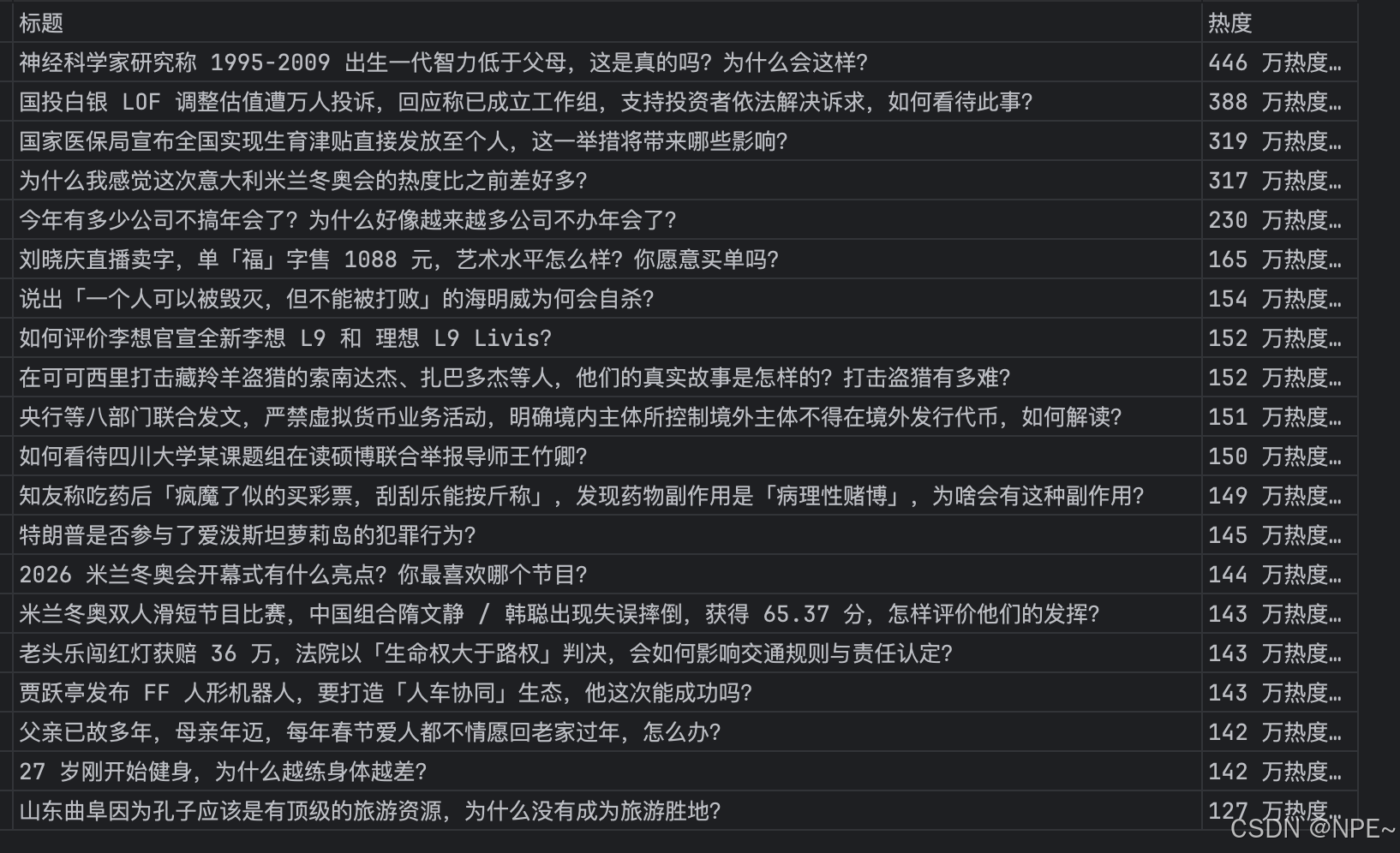 print(f"成功获取 {len(results)} 条热榜数据,已保存至 知乎热榜.xlsx")