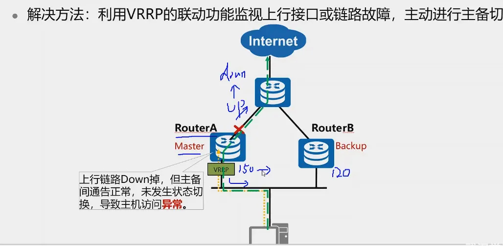 解决方法:利用VRRP的联动功能监视上行接口或链路故障,主动进行主备切换降低或增加优先级