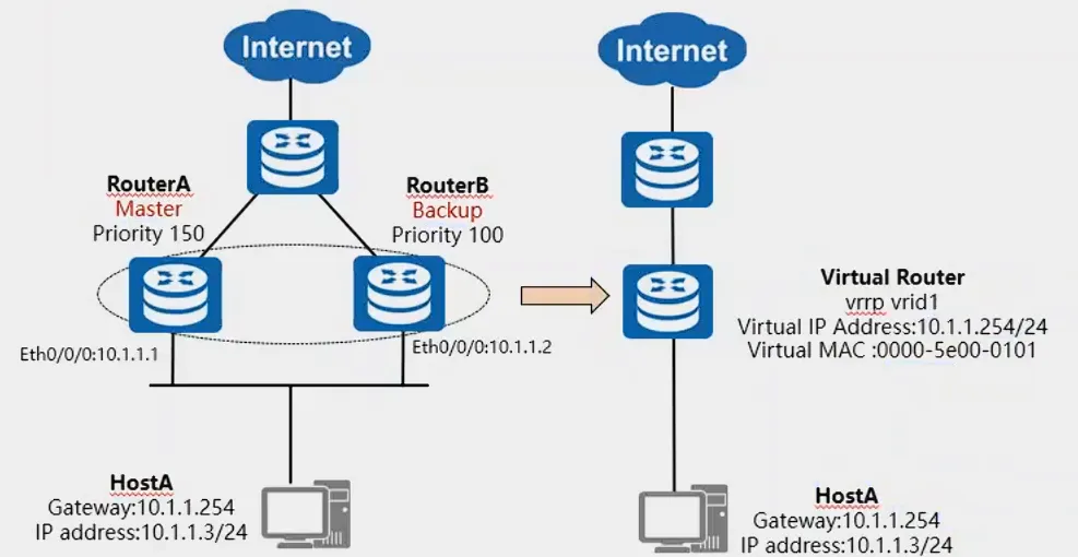虚拟路由器:由一个Master和多个Backup组成,被当成一个共享局域网内主机的缺省网关,如RouterA和RouterB共同组成一个虚拟路由器,路由器收到ARP请求以一个虚拟MAC地址去应答