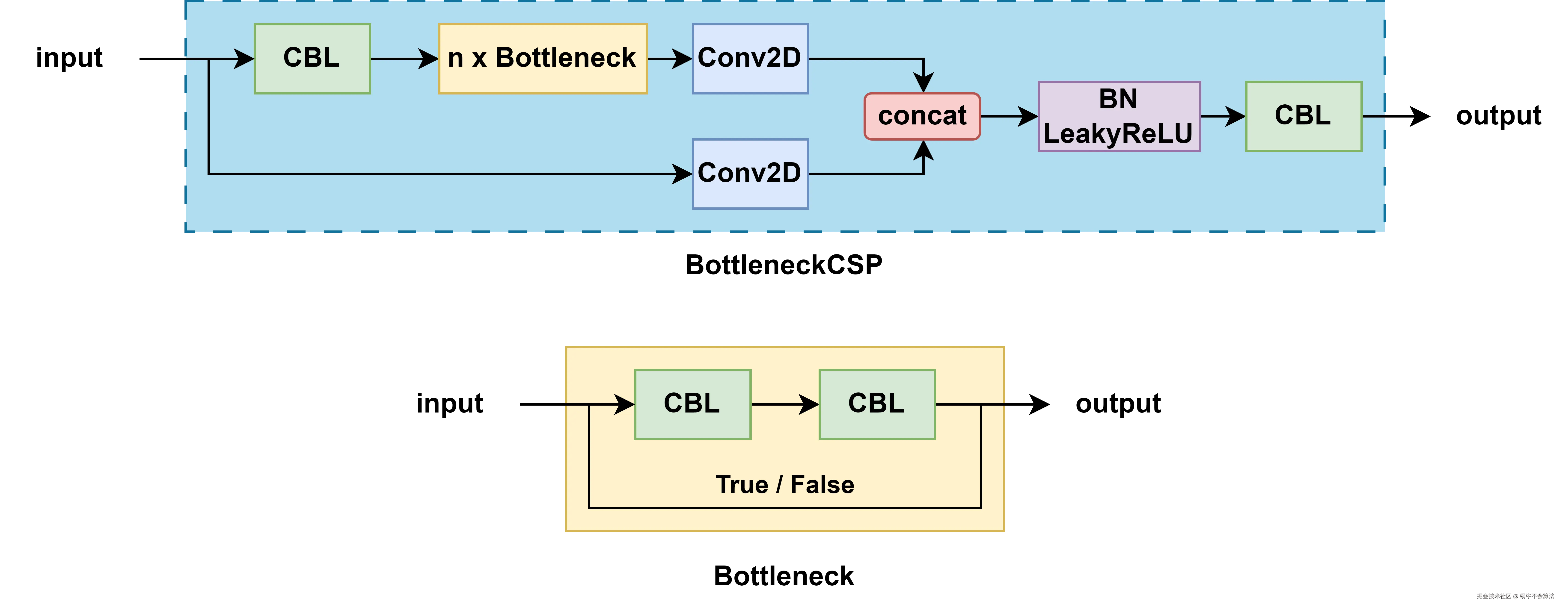 其中的 CBL 模块就是Conv2D + BN + LeakyReLU 的组合,这里的 bottleneck 可以根据传入的参数决定是否带有 shortcut。如果是带有 shortcut 的话,就是正统的 residual 模块了,如果没有 shortcut,就是单纯的 2 个 CBL 串联。