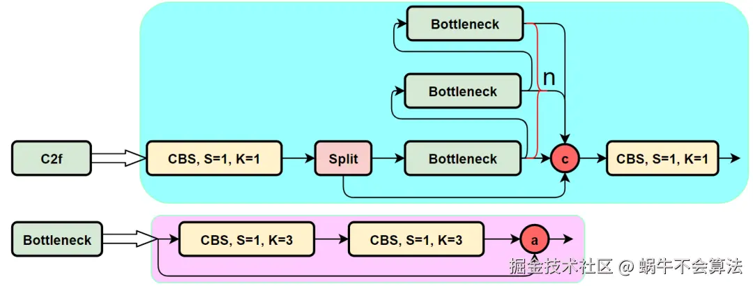 通俗说:C2f 是一个"把输入特征拆多路、依次加工、再把所有中间特征拼回来然后压缩融合"的结构。它的目标是: