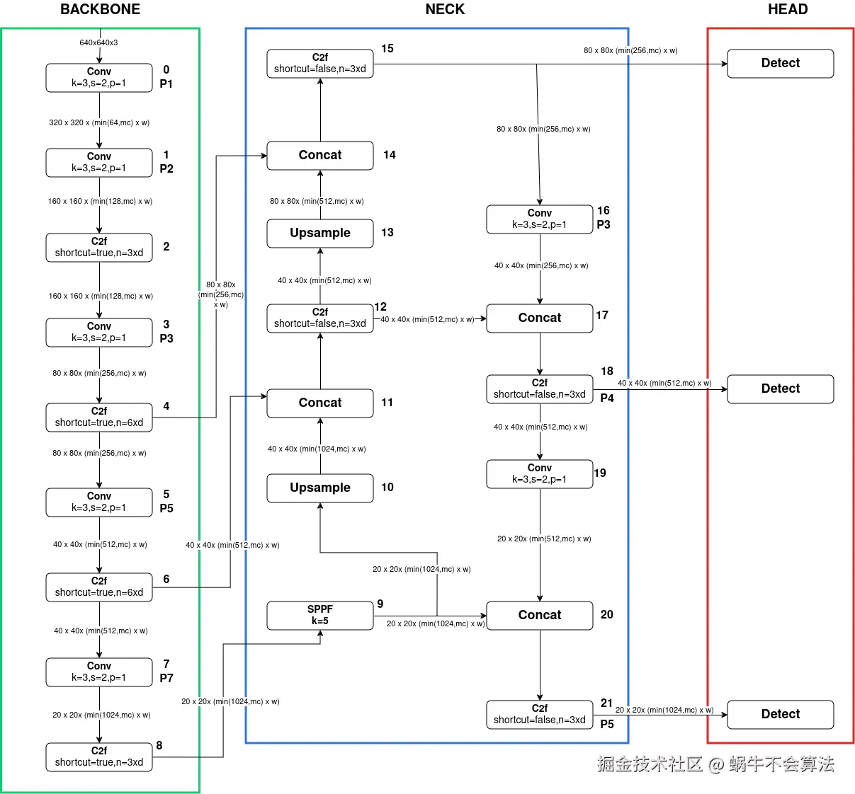 1\][什么是 C2f: YOLOv8 中引入的一种高效特征提取模块_c2f模块](https://link.juejin.cn?target=https%3A%2F%2Fblog.csdn.net%2Fu013172930%2Farticle%2Fdetails%2F154040820 "https://blog.csdn.net/u013172930/article/details/154040820") \[2\][万字详解YOLOv8网络结构Backbone/neck/head以及Conv、Bottleneck、C2f、SPPF、Detect等模块_yolov8网络架构](https://link.juejin.cn?target=https%3A%2F%2Fblog.csdn.net%2Fshangyanaf%2Farticle%2Fdetails%2F139223155 "https://blog.csdn.net/shangyanaf/article/details/139223155")