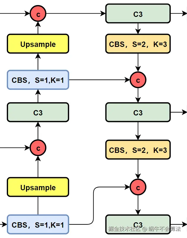 融合后的P3 → 下采样 → 与P4融合 → 下采样 → 与P5融合