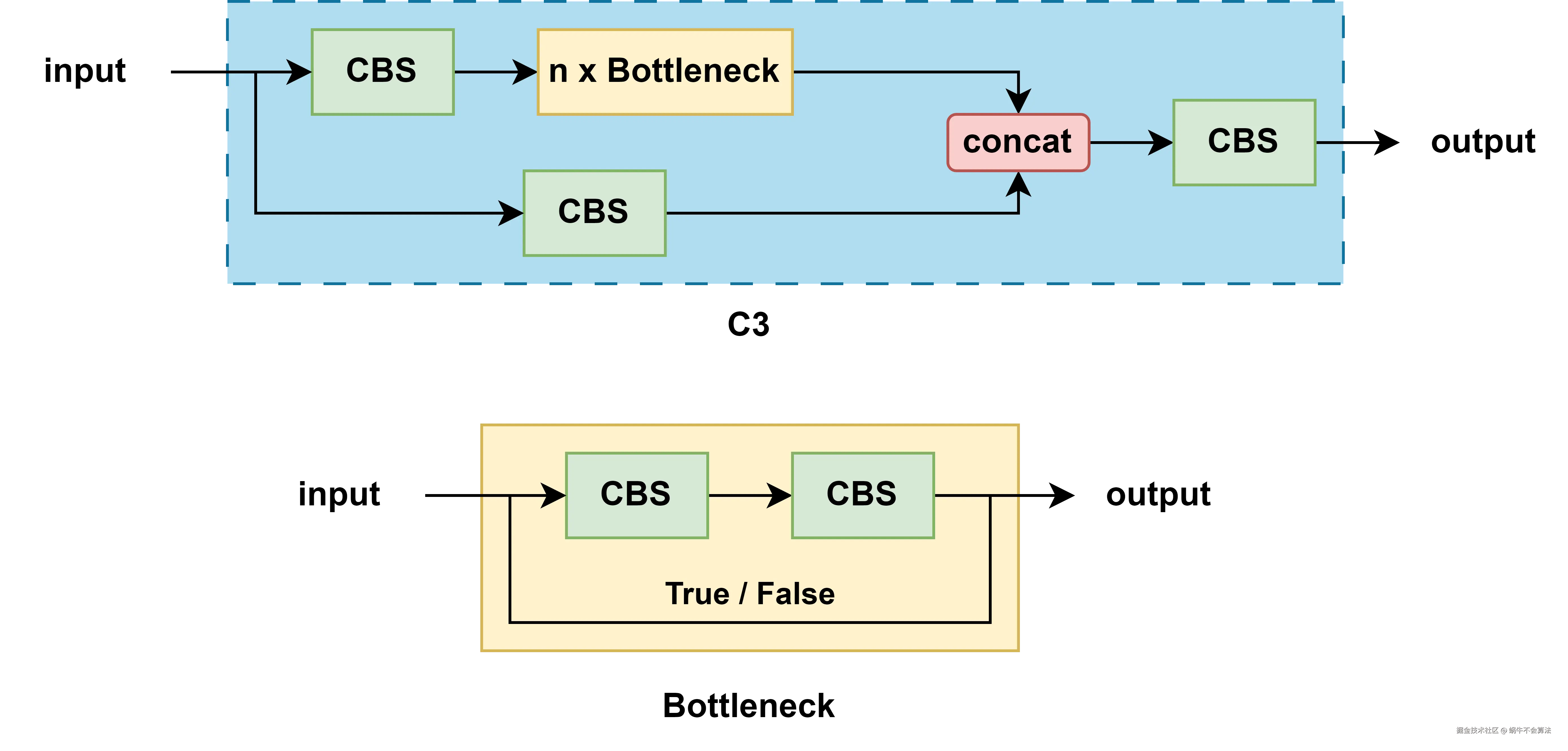 C3 模块因为内部有 3 个卷积模块,所以被命名为 C3 模块,去掉了 BottleneckCSP 中一些繁杂的 Conv2d 操作,并且将激活函数从 LeakyReLU 换成了 SiLU。 CBL 模块也因此变成了 CBS 模块。CBS 模块:Conv + BatchNorm + SiLU。和 BottleneckCSP 一样,内部的 bottleneck 也分为带 shortcut 和不带 shortcut 两种。