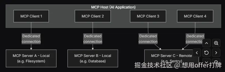 例如:Visual Studio Code 充当 MCP 主机。当 Visual Studio Code 与 MCP 服务器(例如Sentry MCP 服务器)建立连接时,Visual Studio Code 运行时会实例化一个 MCP 客户端对象来维护与 Sentry MCP 服务器的连接。随后,当 Visual Studio Code 连接到另一个 MCP 服务器(例如本地文件系统服务器)时,Visual Studio Code 运行时会实例化另一个 MCP 客户端对象来维护此连接。