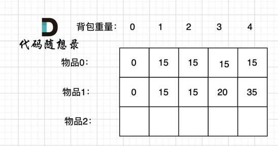 第二行的解释:背包容量为 0,放不下物品0 或者物品1,此时背包里的价值为0。背包容量为 1,只能放下物品0,背包里的价值为15。背包容量为 2,只能放下物品0,背包里的价值为15。背包容量为 3,上一行同一状态,背包只能放物品0,这次也可以选择物品1了,背包可以放物品1 或者 物品0,物品1价值更大,背包里的价值为20。背包容量为 4,上一行同一状态,背包只能放物品0,这次也可以选择物品1了,背包可以放下物品0 和 物品1,背包价值为35。