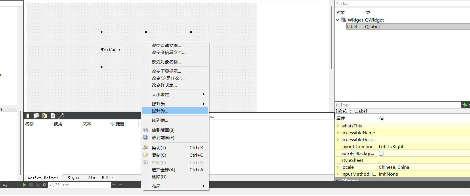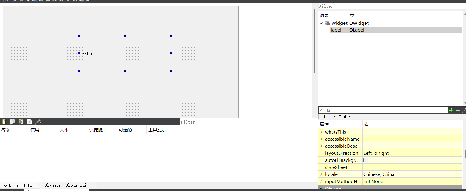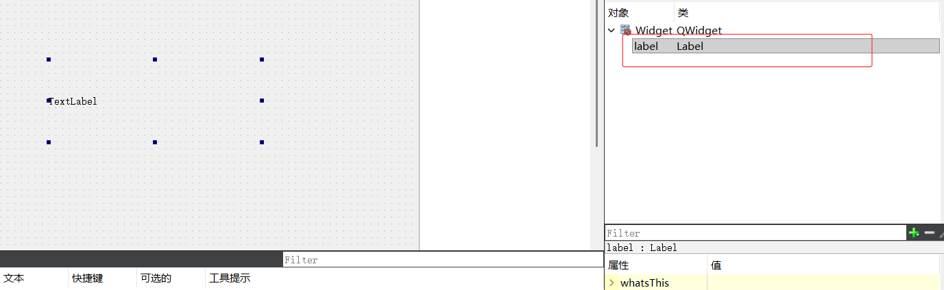 拖入一个内置QLabel控件,通过右侧对象树可知,当前使用的不是子类控件