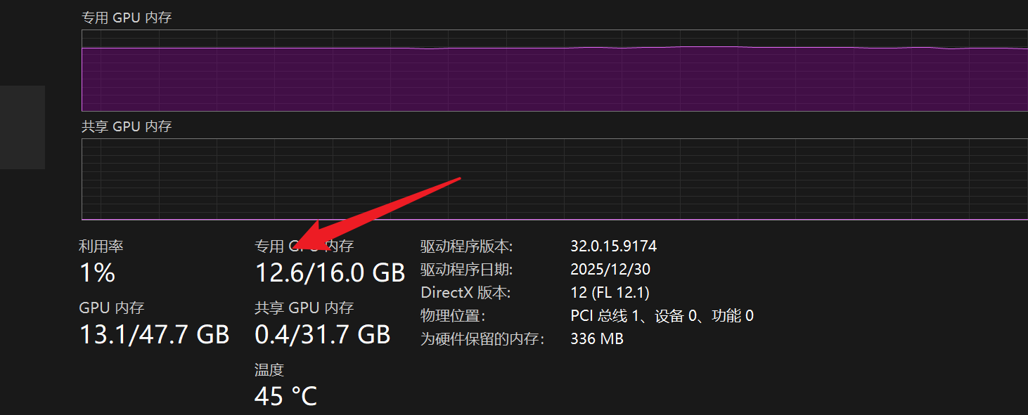 此时打开 Windows 任务管理器查看 GPU 显存,你会发现占用稳定在 7GB - 10GB 左右