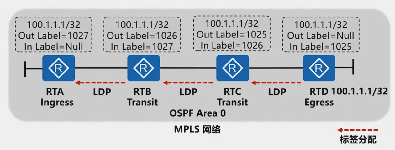 - RTA收到下游邻居RTB分配的100.1.1.1/32与标签的绑定关系后,查看自己IP路由表中到达100.1.1.1/32的下一跳是否为RTB,如果IP路由表中的下一跳为RIB,则RTA使用RTB分配的标签封装到达100.1.1.1/32的数据,如果IP路由表中的下一跳不是RTB,则RTA保留RTB分配的标签作为备用。因为RTA为ingress,最终道德100.1.1.1/32的LSP完成建立