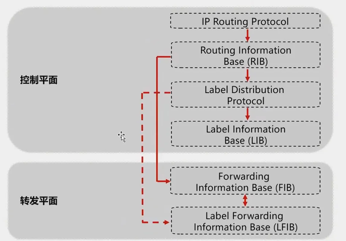 标签转发:在控制层面运行一个标签分发协议(LDP),根据路由表的路由条目生成标签信息(LIB),最后生成LDP生成一个标签转发表(LFIB)