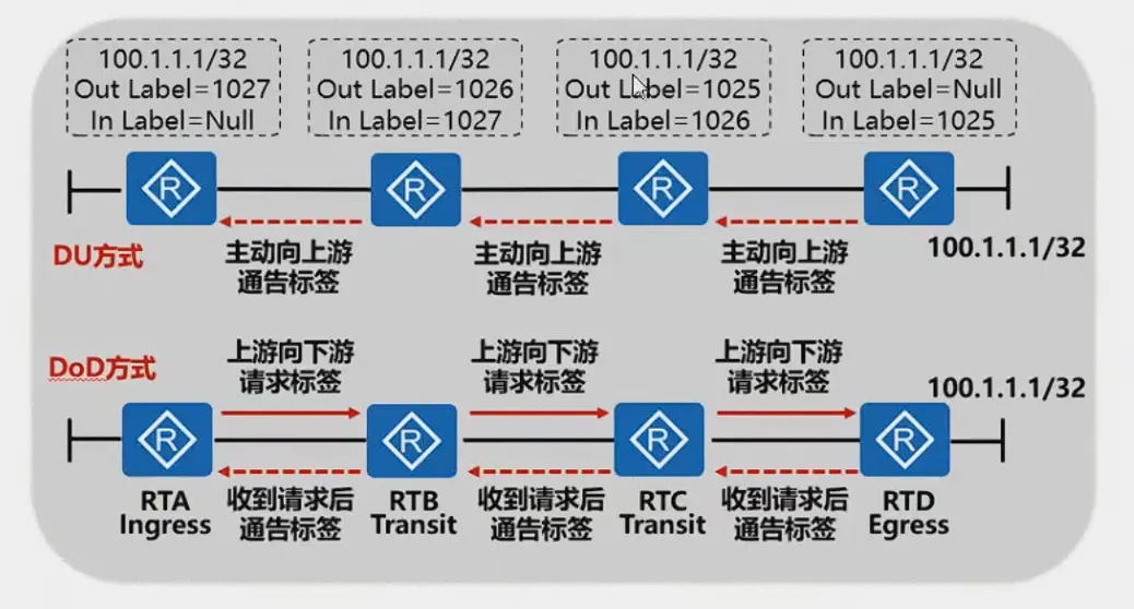 DU(下游自主方式):对于一个到达同一目的地址报文的分组,LSR无需从上游获得标签请求即可进行标签分配与分发(华为默认)