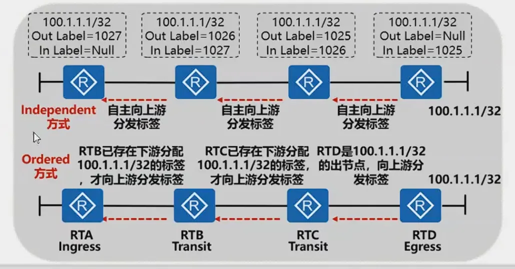 Independent(独立标签分配控制方式):本地LSR可以自主地分配一个标签绑定到某个IP分组,并通告给上游LSR,而无需等待下游的标签。