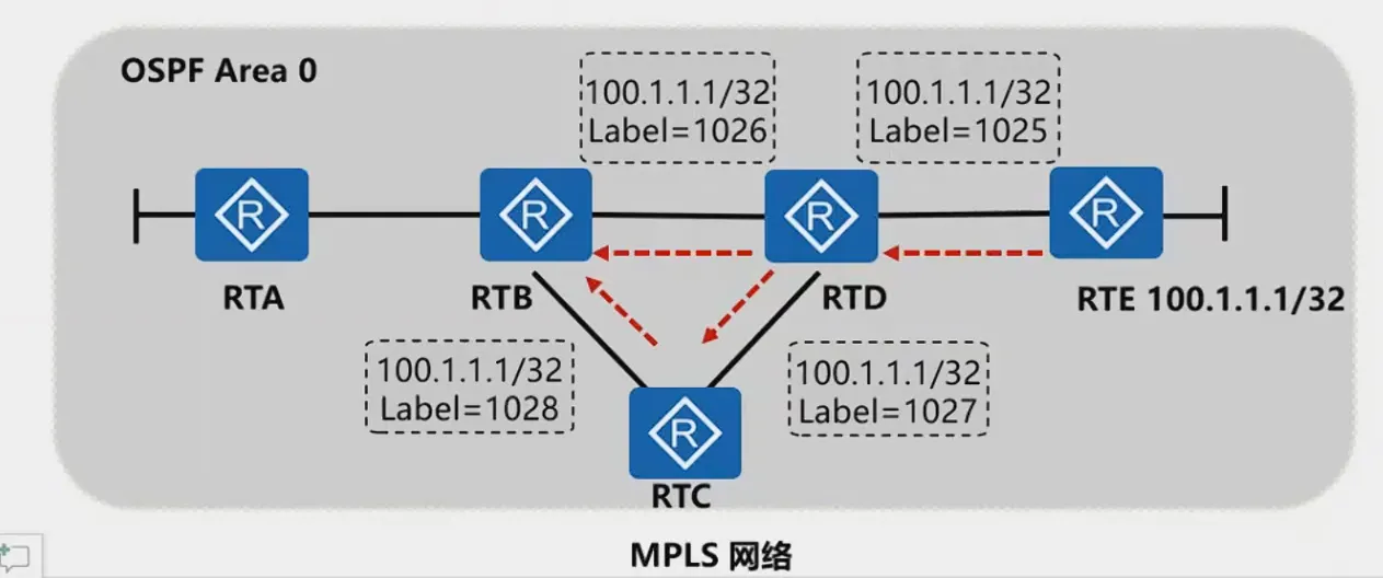 - RTC收到下游邻居RTD分配的100.1.1.1/32的绑定关系后,将标签记录在自己的LIB表中,并向上游邻居RTB发布100.1.1.1/32与标签的绑定关系,同时RTC查看自己IP路各由表中到达100.1.1.1/32的下一跳是否为RTD,如果IP路由表中的下一跳为RID,则RTC保留RTD分配跳为RTD,如果IP路由表中的下一跳不是RTD,则RTC使用RTD分配的标签作为备用标签