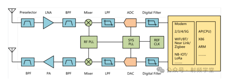 零中频架构具有体积小、功耗低、成本低、便于集成、性能优越等特性,目前占据市场主导地位,广泛应用于Wi-Fi,5G,收音机等。