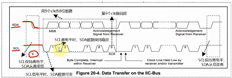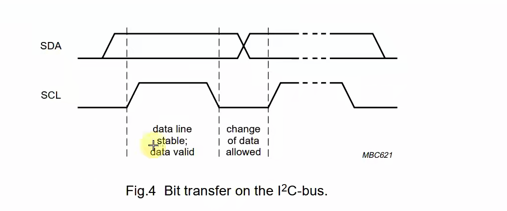 在SCL处于高电平期间,SDA处于稳定状态;SCL处于低电平期间,SDA变成要保持的状态等SCL拉高以后读/写。
