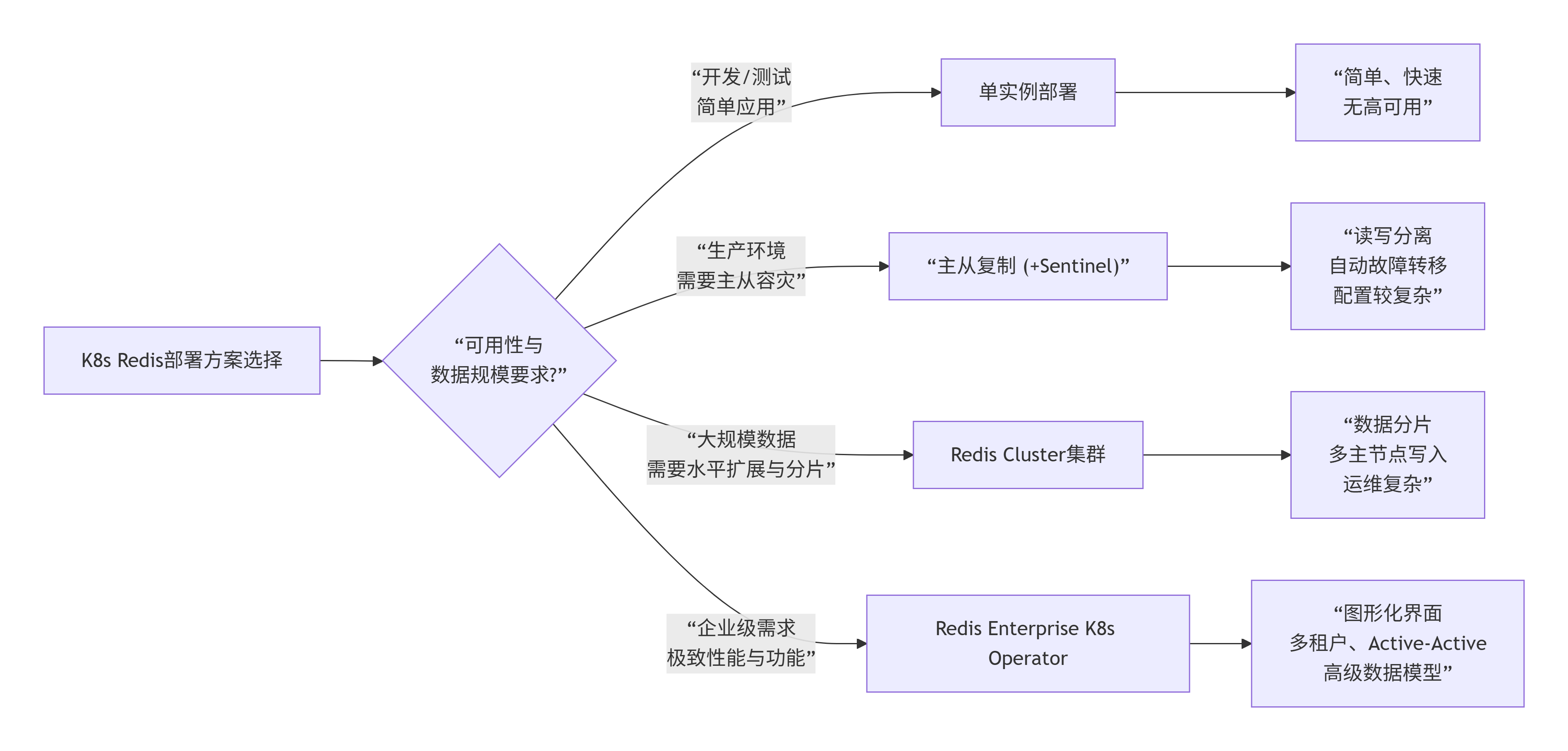 在Kubernetes中部署Redis,有多种成熟方案可选,从简单的单实例到企业级集群,能满足不同场景的需求。下图梳理了这几种核心方案,帮助你快速决策。