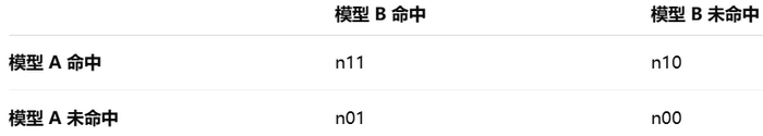 McNemar检验仅关注两个条件存在差异的单元格:McNemar仅关心n01和n10。n00:模型A和模型B均未命中的样本数。n11:模型A和模型B均命中的样本数。n01:模型A未命中,但模型B命中的样本数。n10:模型A命中,但模型B未命中的样本数。