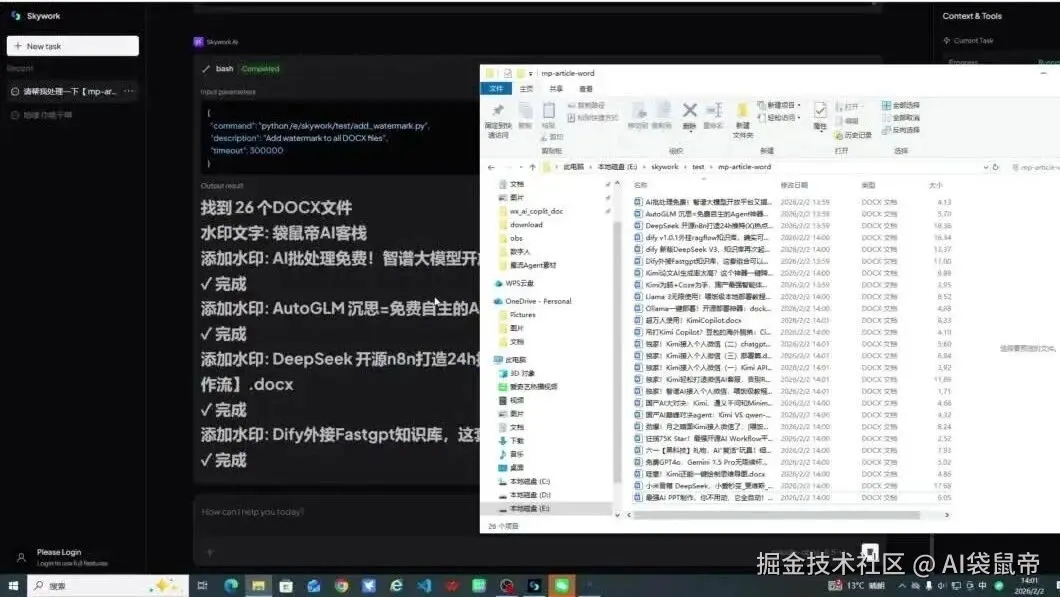 Skywork 迅速识别了文件夹内容,一步步思考,指定计划,最后完成了所有文件的转换,并加上了水印。