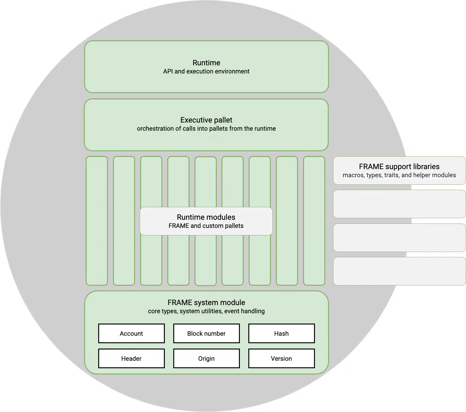 FRAME 提供了覆盖共识、质押、余额、治理等常见功能的 pallet 库。这些 pallet 的特点是: