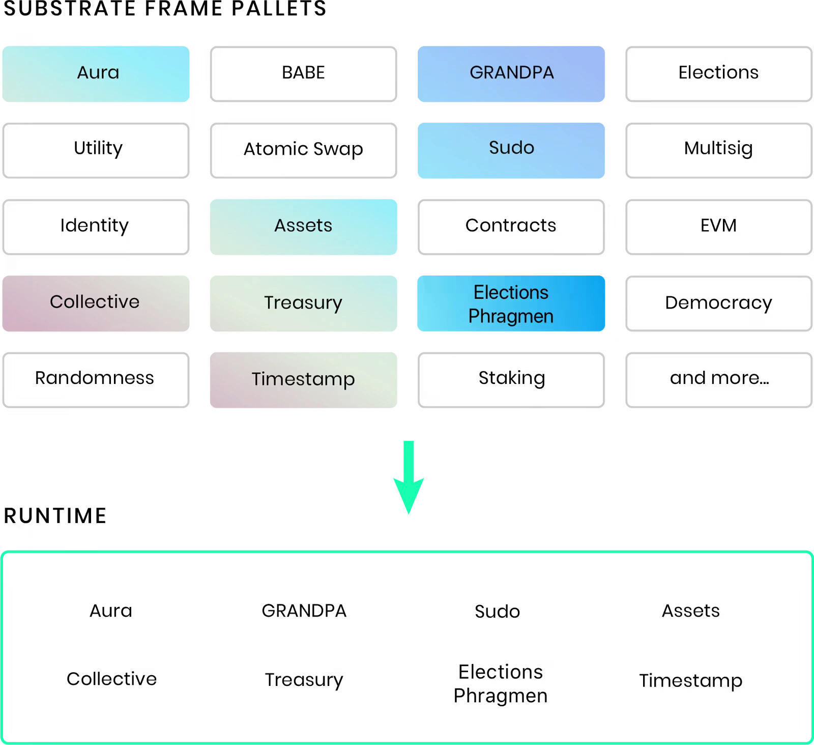 如果你把 Runtime 看作一个产品,那么 pallet 就是产品功能包。你的链能做什么,取决于你组合了哪些 pallet,以及你如何配置它们。