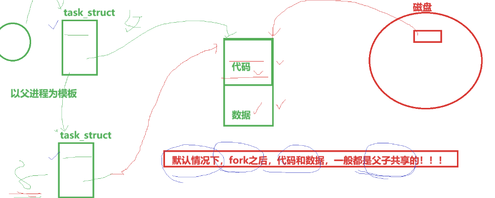默认情况下fork后 子进程会以父进程为模版 生成一个task_struct,但是代码和数据二者事共享的