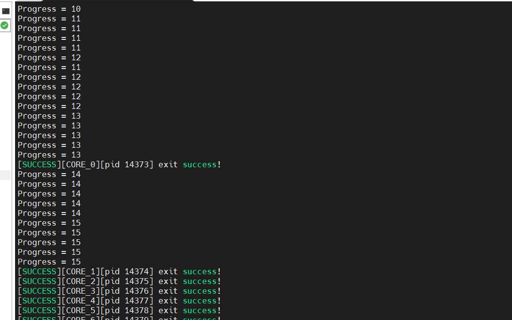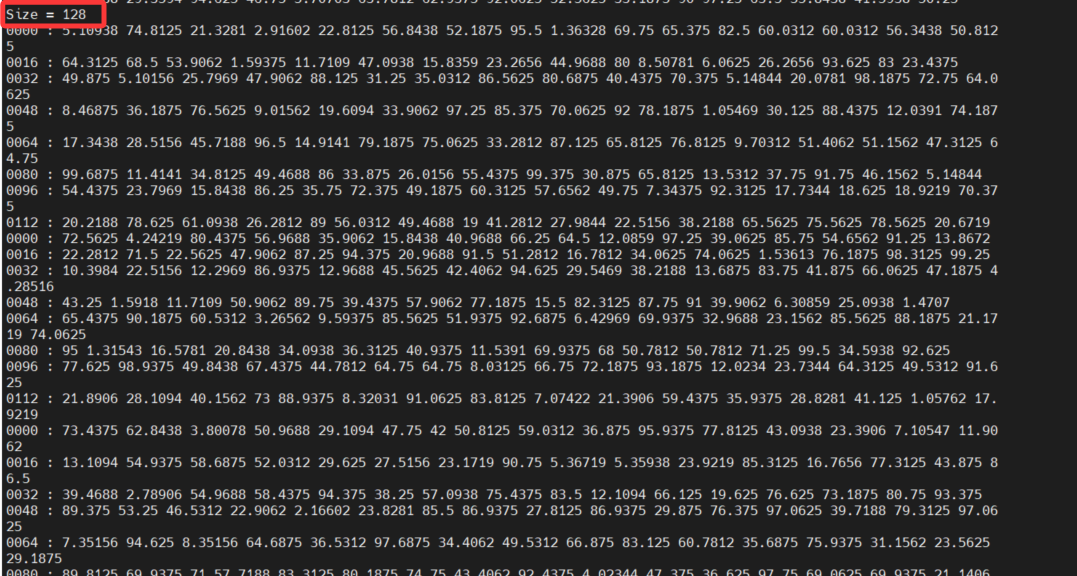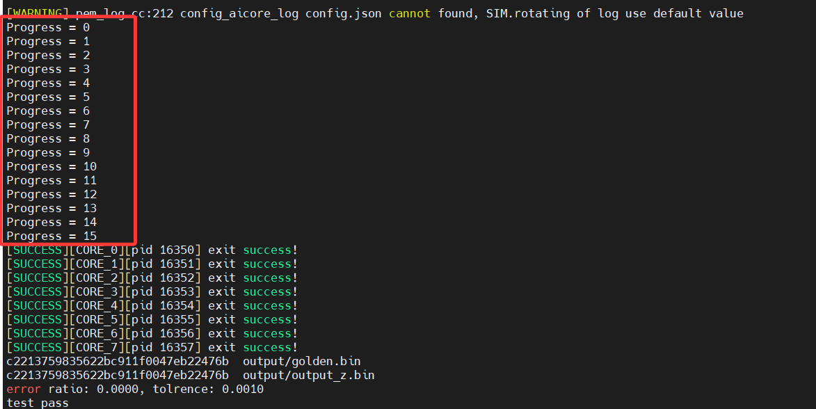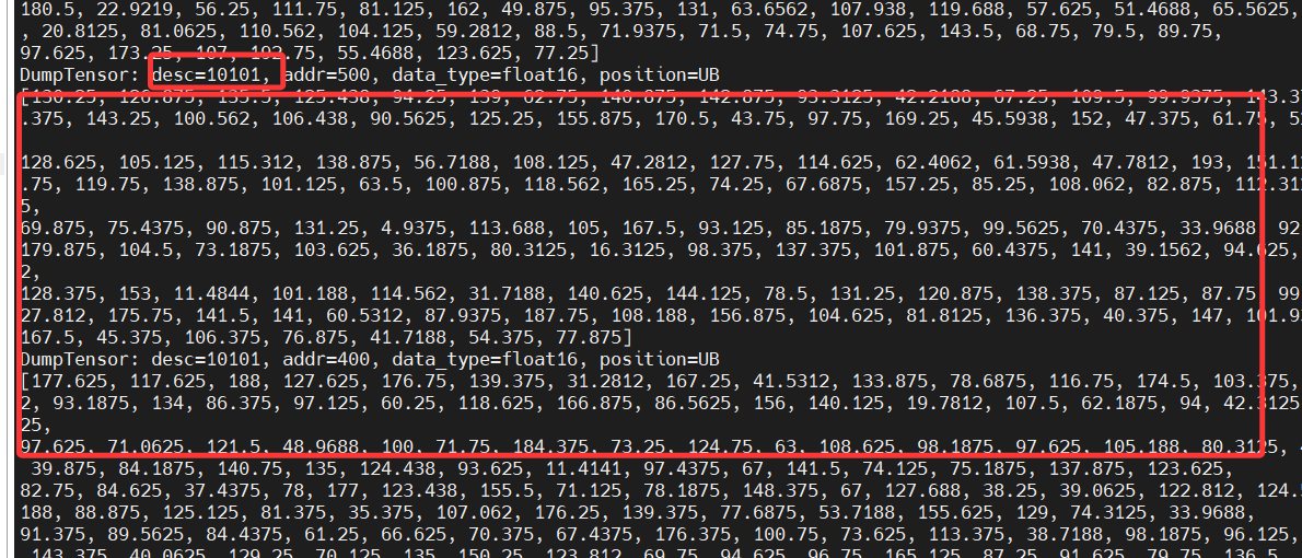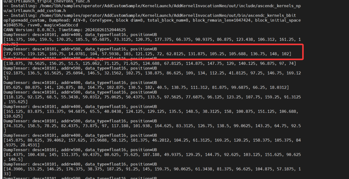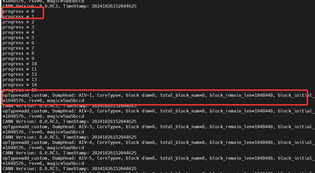 会发现输出很乱,是因为我们有8个核,多核运行相同的算子,每个核内部循环16次处理数据,因此会有8组重复的0-15。