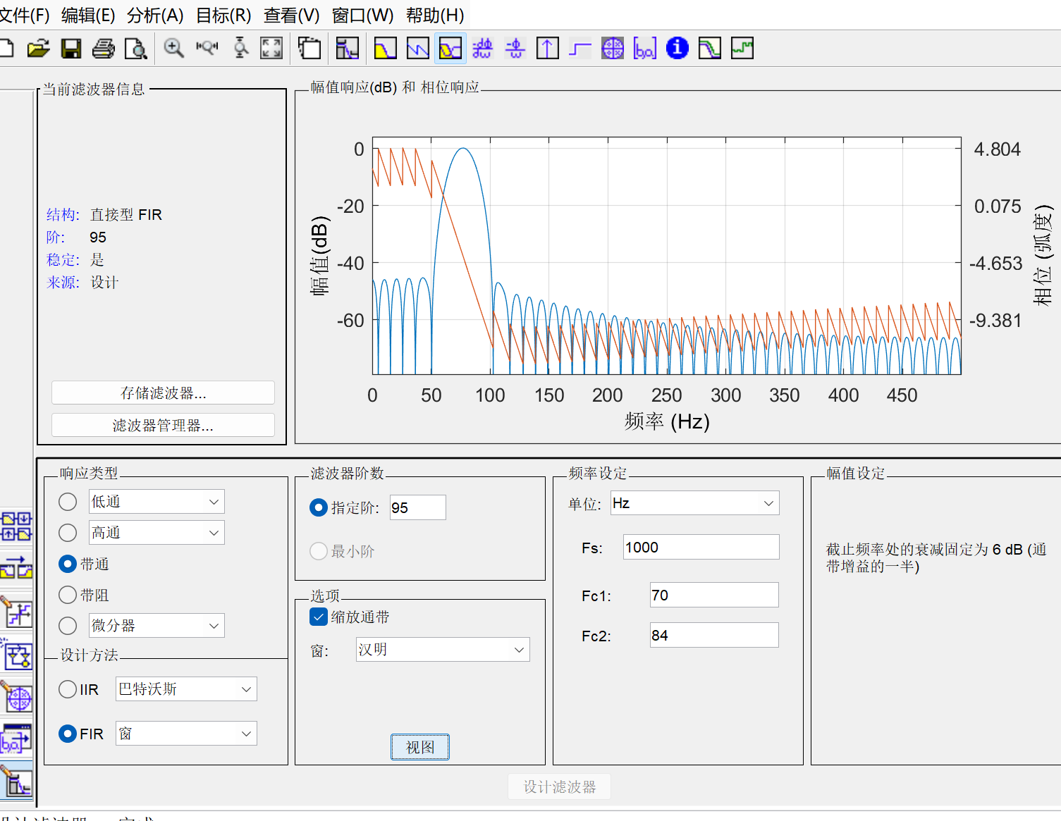 FDATool是MATLAB信号处理工具箱里专用的滤波器设计分析工具。FDAToo'l可以设计几乎所有基本的常规滤波器,包括FIR和IIR的各种设计方法。它操作简单,方便灵活口"。下面以采用海明窗函数设计一个95阶的带通滤波器为例,来讲解FDATool的使用方法,该滤波