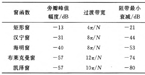 使用窗函数设计FIR滤波器时,要根据给定滤波器指标选择合适的窗函数和窗宽度N。在设计FIR滤波器的过程中,一个重要的计算就是怎么加窗。采用矩形窗是最直接简单的方法,但采用矩形窗会产生很大的"Gibbis效应",且矩形窗的第一旁瓣仅比主瓣衰减13 dB。故在实际应用设计中,一般采用其他窗函数,得到实际设计的FIR数字滤波器的单脉冲响应序列口。目前几种主要的窗函数分别为:矩形窗、三角形窗、汉宁窗、哈明窗、布莱克曼窗和凯泽窗等。表中的数据给出了它们的性能比较.