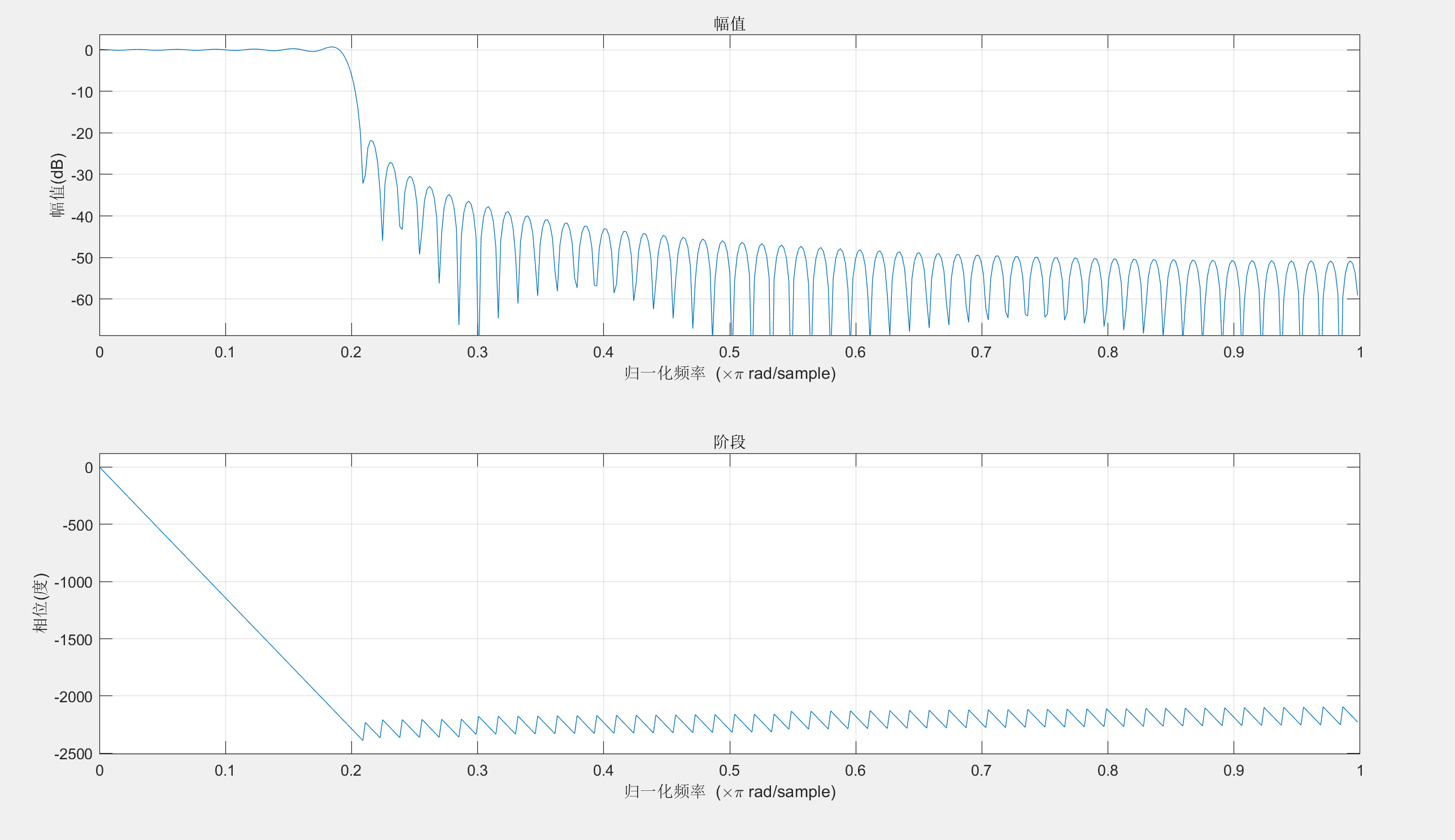 MATLAB软件提供了丰富的工程应用实践,同时,MATLAB信号处理工具箱也提供了各种窗函数滤波器设计函数和滤波器实现函数。本文的滤波器设计程序语言如图所示,执行该程序所得的滤波器幅频一相频特性如图所示: