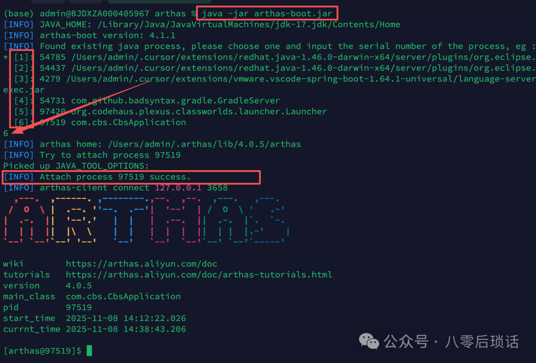 启动后,Arthas会列出当前机器上所有的Java进程,我们只需要输入对应的序号,就能连接到目标进程,比如小编要诊断ID为97519的进程,输入"6"回车即可成功进入Arthas的命令行界面。