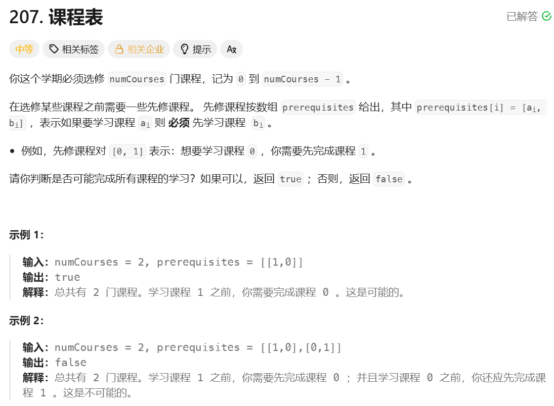 **思路:**这道题中课程和课程的先后顺序构成了一个有向图,判断是否可能完成所有课程的学习其实就是判断有向图是否有环。先建图,并且将每个点的入度存储起来,然后借助队列进行 bfs,取出队头元素,将这个点指向的其他点的入度减 1,判断这个点入度是否为 0,如果为 0,将其加入队列。当队列为空时,判断是否还有点的入度不为 0,如果有,就说明成环了,不可能完成所有课程的学习。
