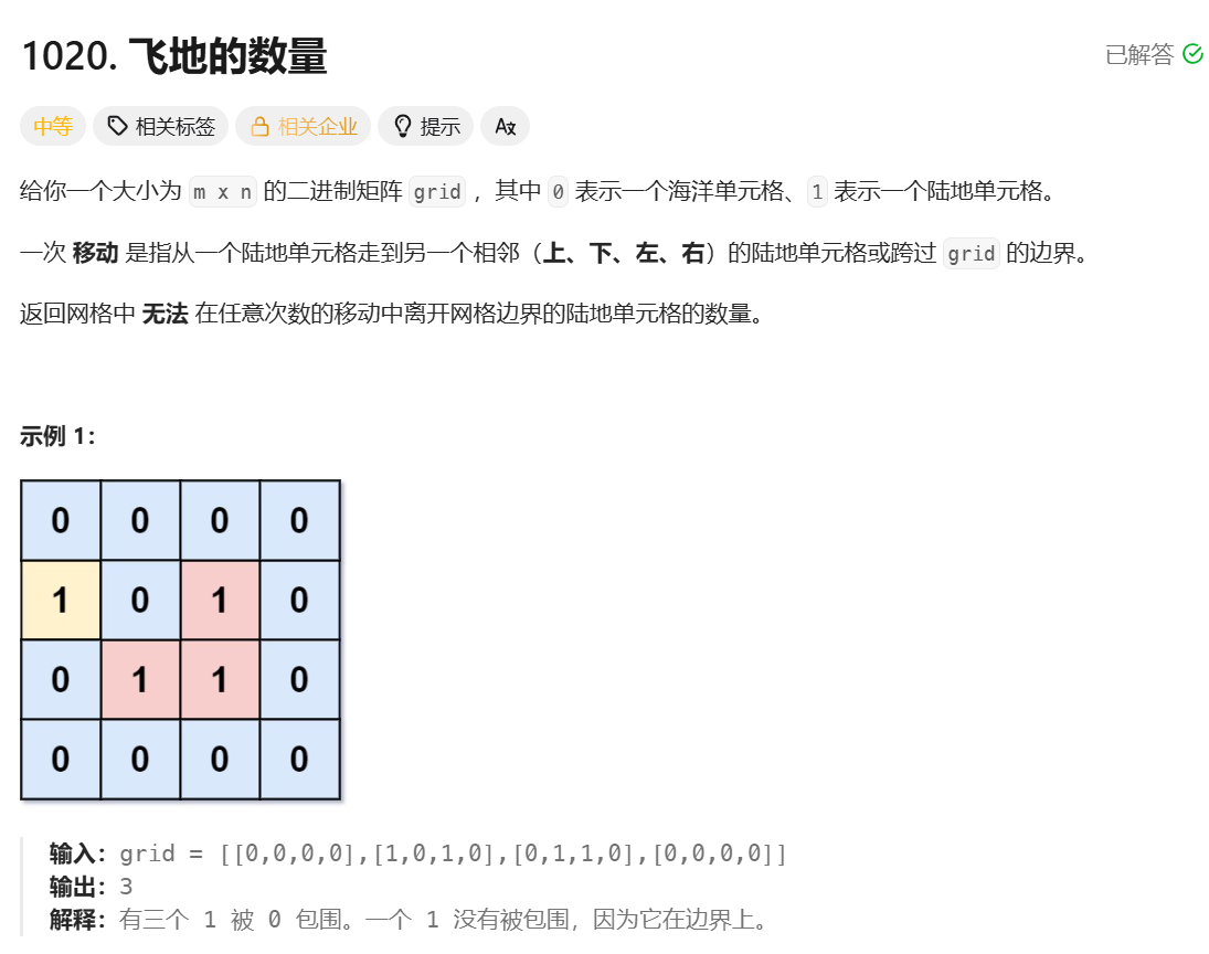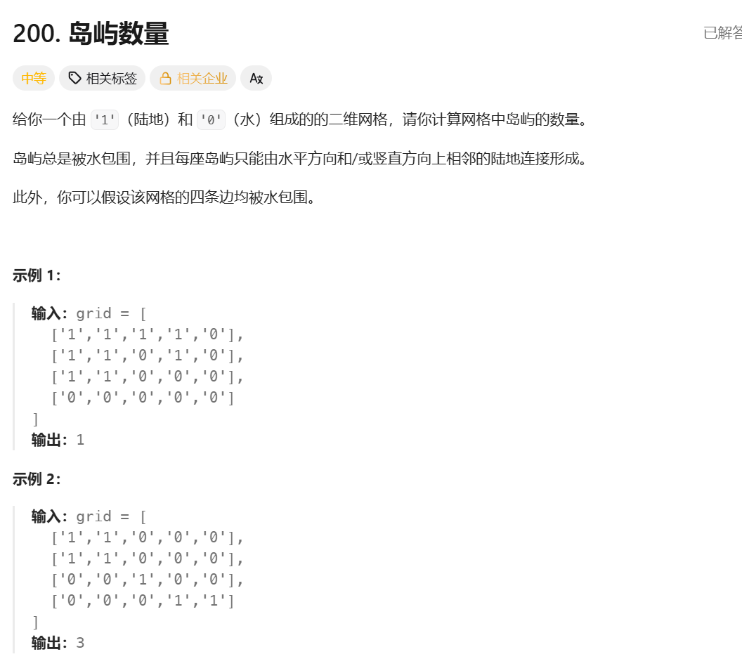 **思路:**首先定义一个数组(命名为 visited),用来标记哪些 1 被遍历过了,遍历二维矩阵,遇到没有被统计过的 1,就通过 BFS 的方式找到这个 1 所在的整个岛屿,并且将这个岛屿中所有的 1 都在 visited 中标记一次,然后岛屿数量加 1,这样后续遍历遇到的 1 如果还是这个岛屿中的,因为有 visited 的缘故,就不会造成重复统计的问题了。