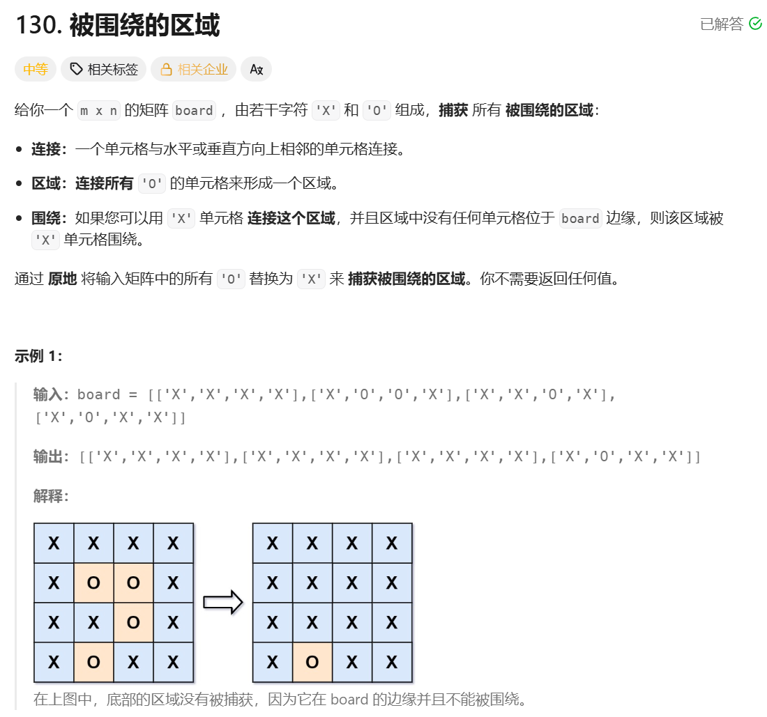 **思路:**正难则反,这道题如果直接找被包围的并修改比较困难,我们可以先遍历矩阵的四个边,找没有被包围的部分,然后把没有为包围的 'O' 标记一下,然后遍历二维矩阵,当遇到没有被标记的 'O',说明它是被包围的,使用 BFS 找到整块区域,并且边找边修改。