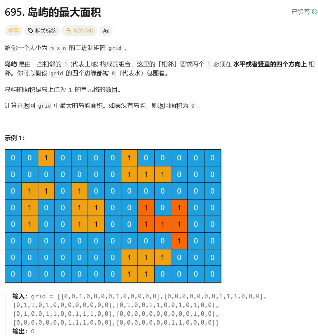 **思路:**遍历二维矩阵,当遇到一个没有统计过的 1 时,使用 BFS 统计出这个 1 所在整个岛屿的 1 的数量,这个 1 的个数就是面积,然后取所有面积中最大的即可。BFS遍历岛屿还是借助队列,先将第一个遇到的 1 丢入队列,然后当队列不为空时,依次取出队列元素,然后判断取出元素的上下左右是否存在没有统计的 1,有就让它入队列,直到队列为空,这个岛屿就统计完成,找出整个岛屿的同时记录岛屿的面积(即 1 的数量)。标记 1 是否统计过使用一个标记数组即可。