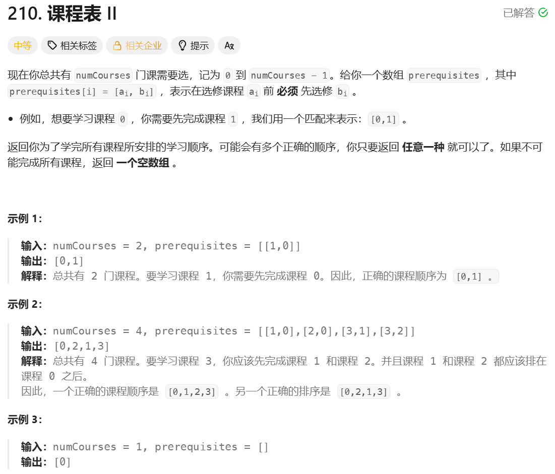 **思路:**这道题思路和上一道题一样,只不过上一道题判断是否成环,这道题是把拓扑排序后的结果返回。