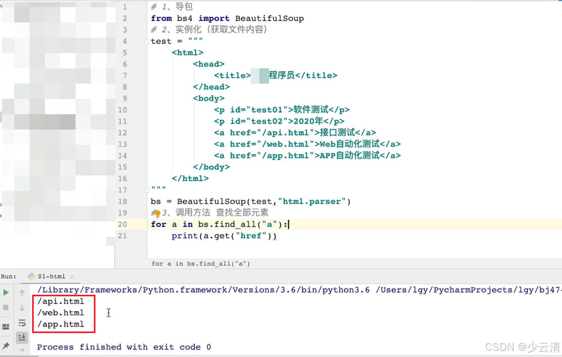 - "html.parser": Python标准库中的HTML解析器。BeautifulSoup还支持一些第三方的解析器,如:lxml、html5lib等,这些第三方解析器需要额外安装