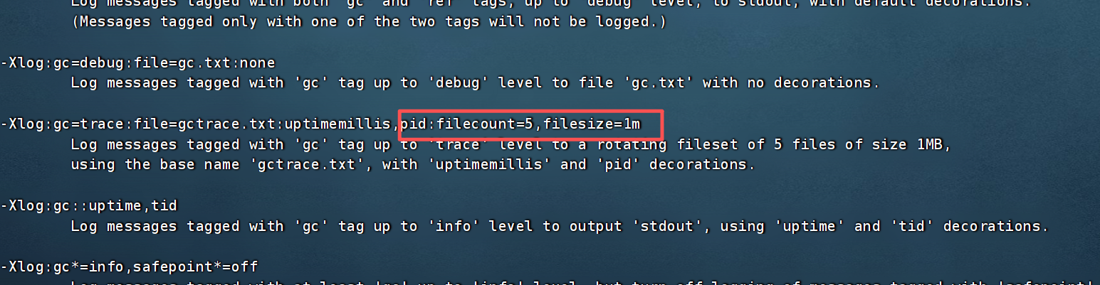 刚开始的时候,配置filecount和filesize的时候总是报错,后台使用命令查看当前jvm中-xlog的帮忙信息才配置对: