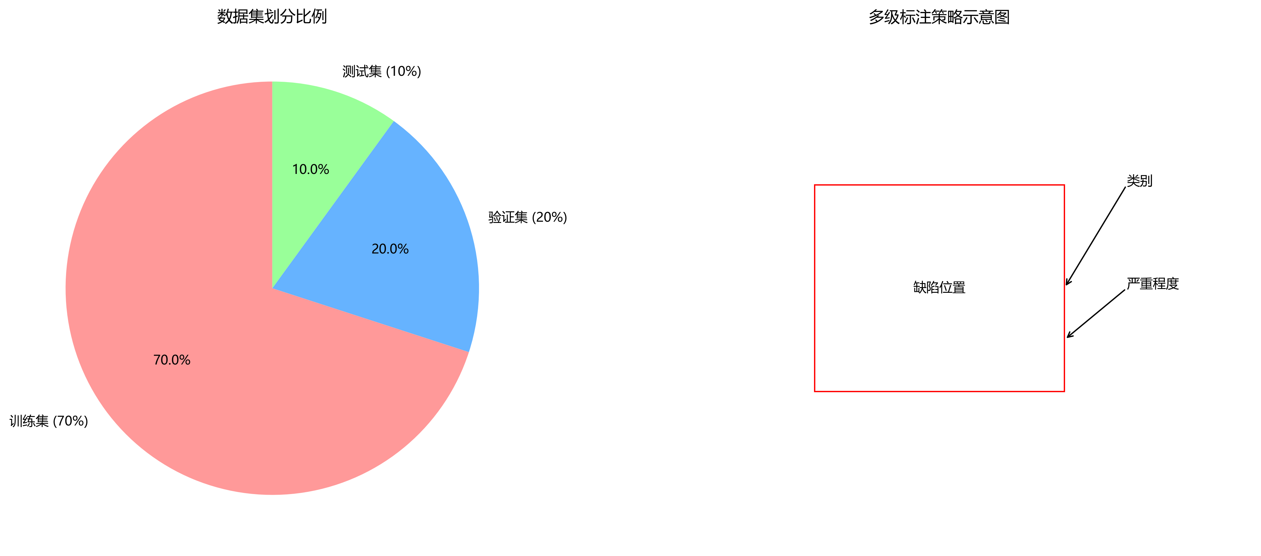 数据集的划分比例为7:2:1,即70%用于训练,20%用于验证,10%用于测试。这种划分方式确保了模型有足够的训练数据,同时保留了独立的测试集用于客观评估模型性能。在标注过程中,我们采用了多级标注策略,不仅标注缺陷的位置和类别,还标注了缺陷的严重程度,为后续的缺陷分类和分级提供了更丰富的信息。