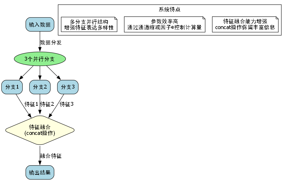 - 参数效率高:虽然增加了分支数量,但通过通道缩减因子e,控制了计算量,保持了较高的参数效率。